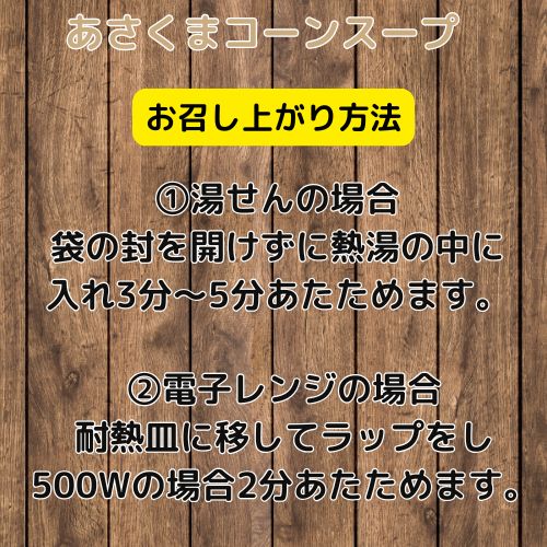 豊かな大地に育まれた、甘みと風味の強いスイートコーンを100%使用した、「あさくまコーンスープ」は、濃厚で贅沢な味わいが口の中で広がります。
