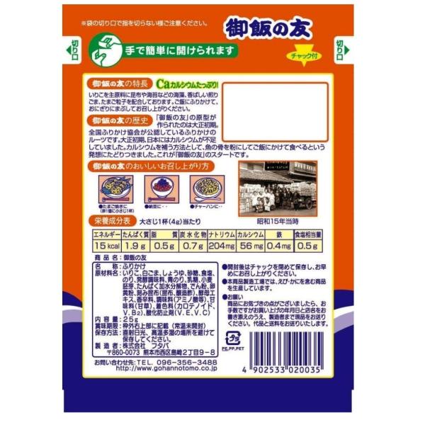 いりこを主原料に昆布や海苔などの海藻、香ばしい煎りごま、たまご粒子を配合しております。ご飯にふりかけて、おにぎりにまぶしてお召し上がりください。