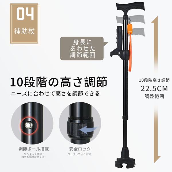 ステッキ、介護杖、起き上がり補助、アルミ合金、軽量、滑りにくい、安定設計、バイオニックベース、男女兼用、高齢者向け、通院、散歩、旅行、携帯便利、折りたたみ、リハビリ、屋内外兼用、人気グッズ