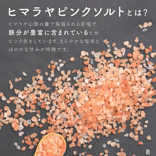 ヒマラヤ山脈の麓で採掘される岩塩で、鉄分が豊富に含まれているため、美しいピンク色をしています。まろやかな塩味とほのかな甘みが特徴です。