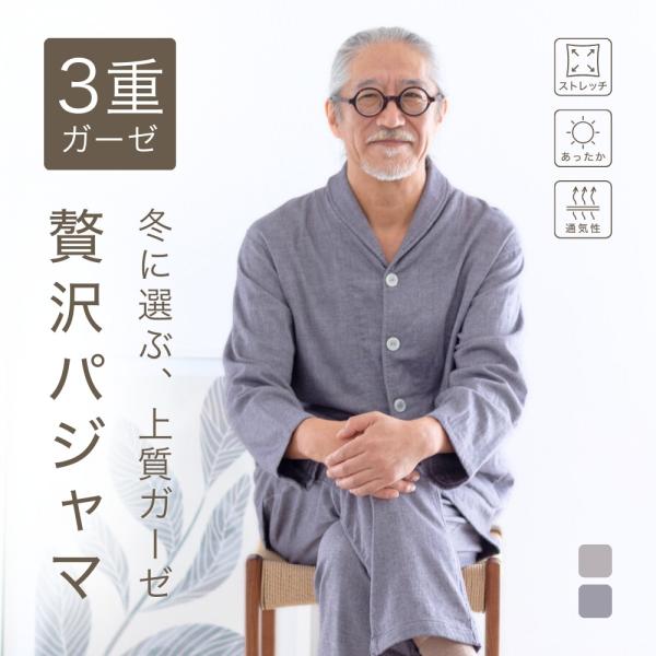 3重ガーゼ パジャマ メンズ 春 冬 誕生日 プレゼント 父 男性 60 70 80 代 疲労回復 長袖 前開き 上下セット 高級 入院