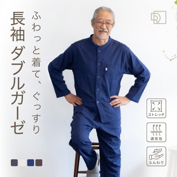 ダブルガーゼ パジャマ メンズ 春 長袖 入院 前開き 疲労回復 寝巻き 高級 誕生日 プレゼント 男性 60 70 80 代