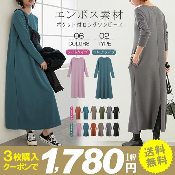 全品Point10倍!最大倍率50% マキシワンピース 長袖 レディース エンボス素材 マキシ丈ワンピー フレア ポケット付 リオティ 即納
