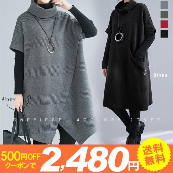 ニットワンピース 秋冬 きれいめ レディース チュニック ケープ チュニックワンピ タートルハイネック ニット 暖か 斜めスリット 大人 ゆったり