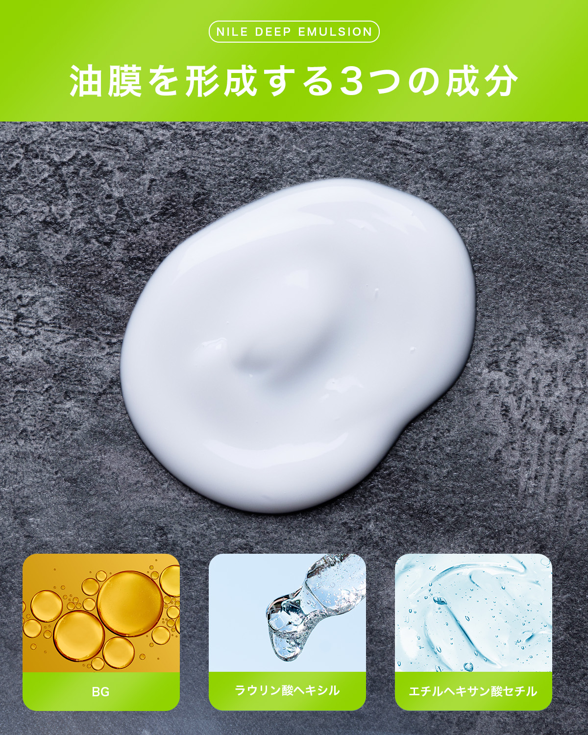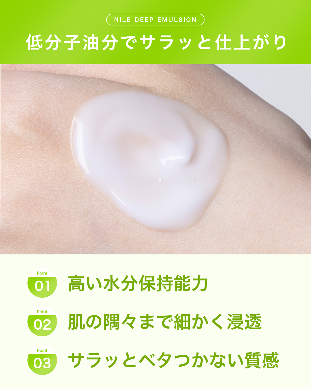 NILEディープエマルジョンは一般的な乳液とは異なり、植物由来のフェイスオイル成分を配合しておりこのオイル成分が、一般的な分子量の50%以下の分子サイズをしているため、肌馴染みが良くベタつきを感じにくい仕上がりとなっています。またこのフェイスオイル成分には潤いの蒸発を抑えながら肌を潤し続けるという機能性があります。