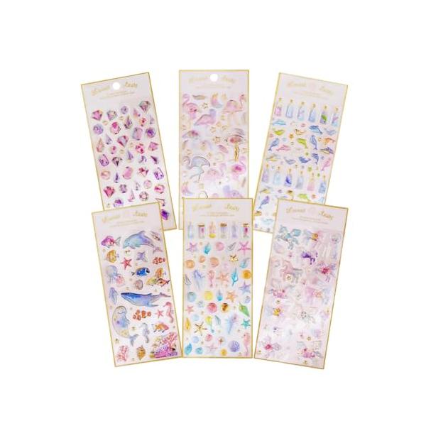 海の生き物シール, 6枚セット, 3Dぷっくりシール, キラキラ箔押し, イルカ・ヒトデ・貝・月・星座デザイン, 手帳デコレーション用, カラフル (宝石)