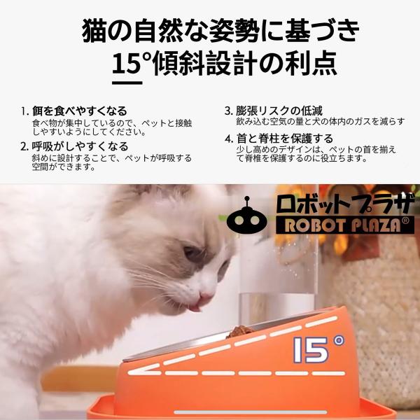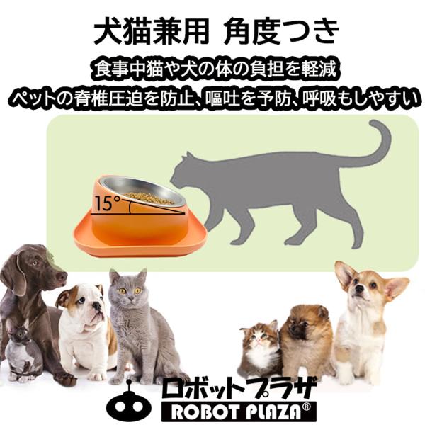 約15度傾斜、食事中猫や犬の体の負担を軽減。食物が自然に集まり、食べやすいす。ペットの脊椎圧迫防止、嘔吐予防、呼吸もしやすい