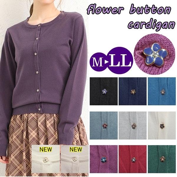 カーディガン 花ボタン レディース Uネック 長袖 シンプル オフィス 伸縮性 送料無料