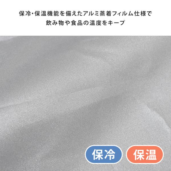保冷・保温機能を備えたアルミ蒸着フィルム仕様で、飲み物や食品の温度をキープ