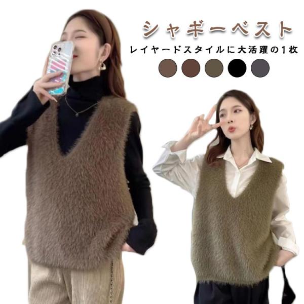 レディース ニットベスト 暖か Vネック ベスト ニット シャギー Vネック シャギーニット シャギーベスト 秋 冬 トップス レイヤード プルオーバ