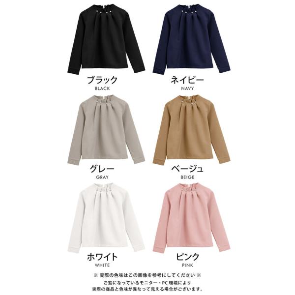 首元のタックとパールが目を惹くパールネックブラウス。
