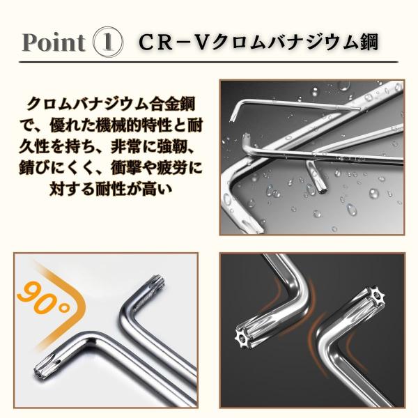 このセットは、トルクスという特殊な形のネジを回すための工具です。トルクスレンチは、中央に小さな穴が開いている「いじり止め」と呼ばれるタイプのネジにも対応しています。セットに含まれているレンチは、サイズが9種類(TH10からTH50)あり、長いので、狭い場所でも作業しやすいです。使いやすくて、車やバイクの整備、家電やその他の機器の修理に役立ちます。