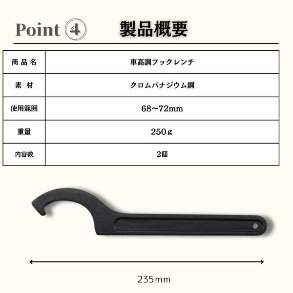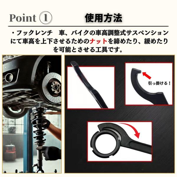 フックレンチは、車やバイクの車高調整に役立ちます。ロックシートやスプリングシートを簡単に回せるので、車の高さを変えたり乗り心地を調整したりする作業がスムーズに行えます。