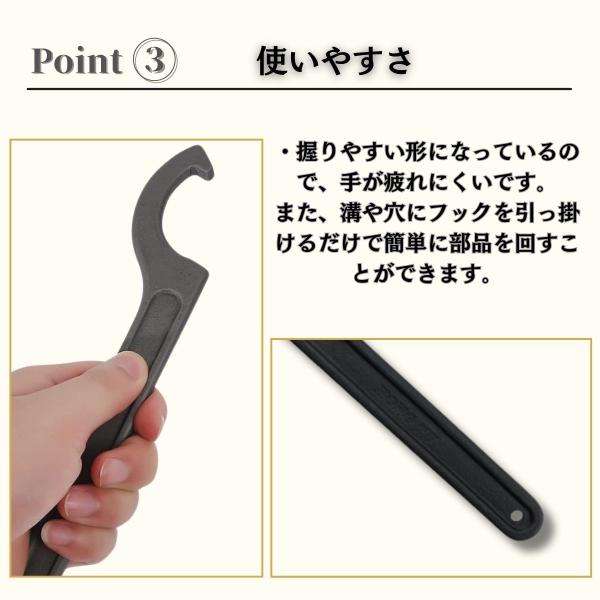 握りやすい形になっているので、手が疲れにくいです。また、溝や穴にフックを引っ掛けるだけで簡単に部品を回すことができます。