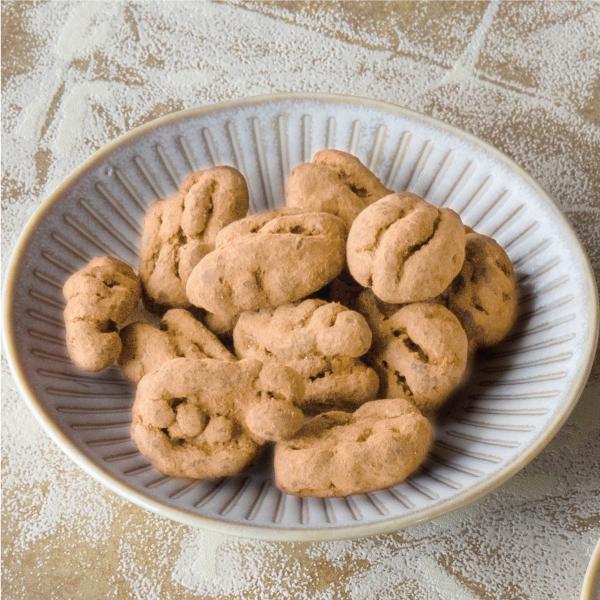 軽くローストしたペカンナッツに、ホワイトチョコレートでコーティング。更にキャラメルパウダーで包みました。