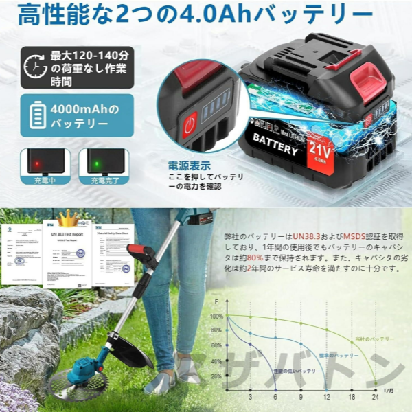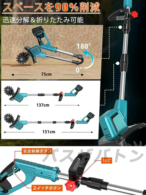 改良点:作業場所に応じて適切なモードを選べ、作業効率がアップします。改良点:耕うん刃を 4 つ付属し、耕運幅が 225mm に達します。改良点:安全ロック機能を備え、起動時に安全ロックボタンとスイッチを同時に押して、誤操作を防ぎます。改良点:補佐ハンドルを付属し、作業内容に応じて位置や角度を自由に調整でき、作業効率を高めます。