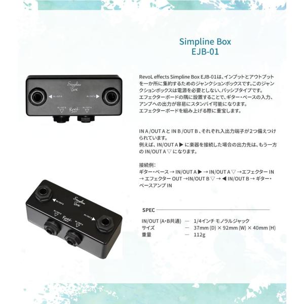 RevoL effects Simpline Box EJB-01は、インプットとアウトプットを一か所に集約するためのジャンクションボックスです。このジャンクションボックスは電源を必要としない、パッシブタイプです。