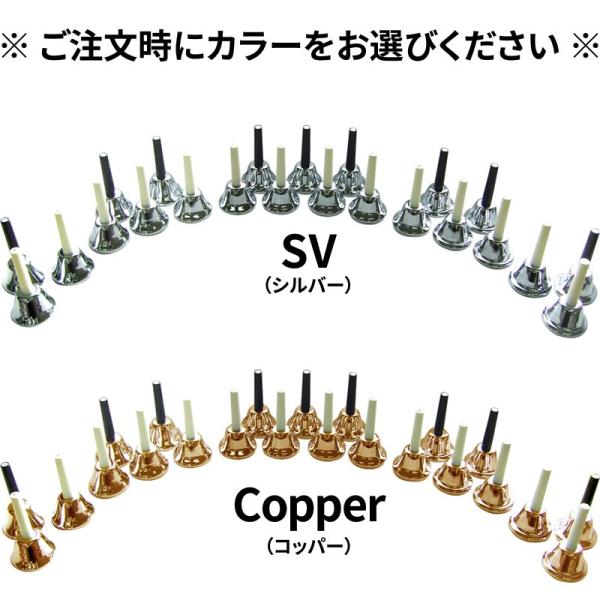 ハンドルを握りベルを振ることで音を鳴らすまさに一般的なハンドベルです。取っ手部先端の表記で、分かりやすく音階を確認することが出来ます。シルバータイプ、コッパータイプいずれも美しい鏡面仕上げとなっており高級感があります。