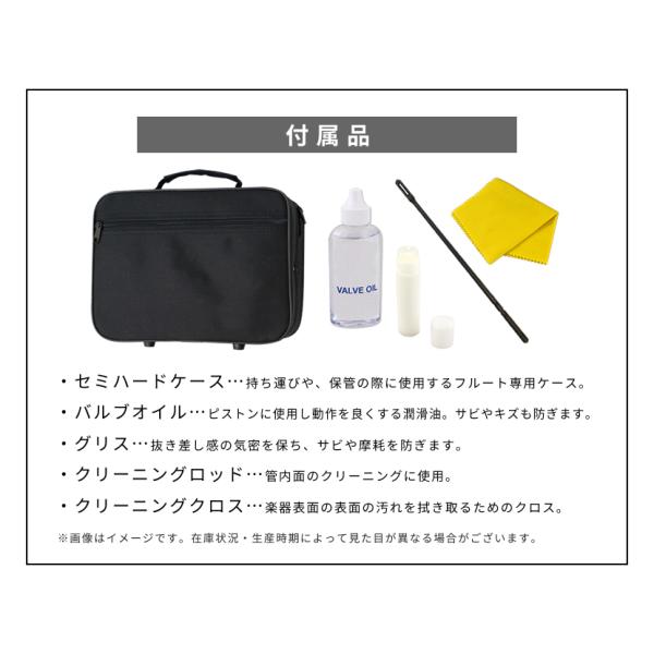 トランペット本体(マウスピース付属)、セミハードケース、バルブオイル、グリス、掃除棒、クロス