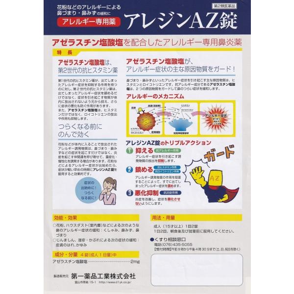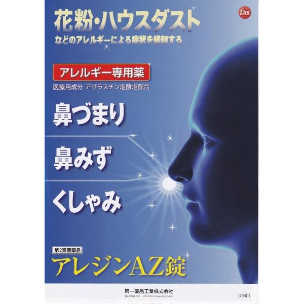 アレジンAZ錠は,花粉やハウスダスト等によるくしゃみ,鼻みず,鼻づまりや,食物等のアレルギーによる皮膚のはれ,かゆみの緩和に効果を発揮します。また症状の軽い早めの時期からの服用が効果的です。