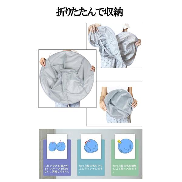【サイズ】おうちでのヘアカットに 便利な散髪用ケープ。コンパクトに畳めるので、あまり場所をとりません。ねじってたたんでコンパクトに収納できます。サイズ:使用時/直径約60cm、収納時/約30cm 約60g ポリエステル、スチール、シンプルな色、においもなく。