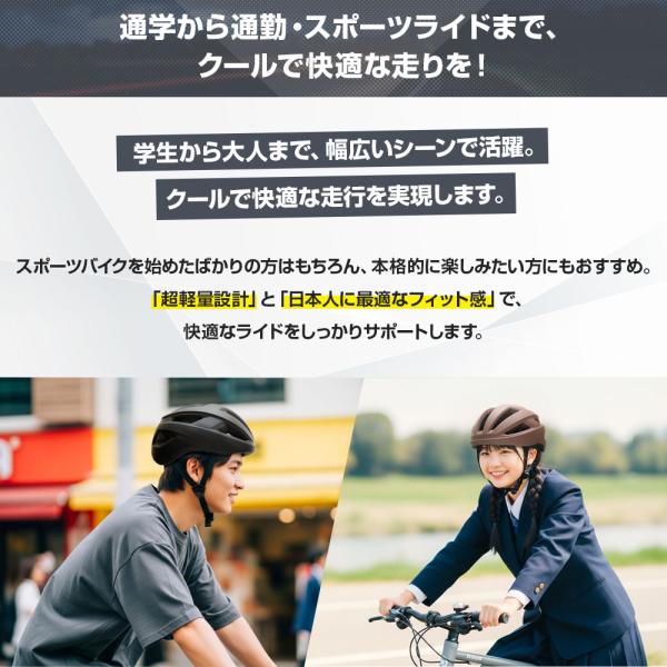 学生から大人まで、幅広いシーンで活躍。クールで快適な走行を実現します。スポーツバイクを始めたばかりの方はもちろん、本格的に楽しみたい方にもおすすめ。「超軽量設計」と「日本人に最適なフィット感」で、快適なライドをしっかりサポートします。