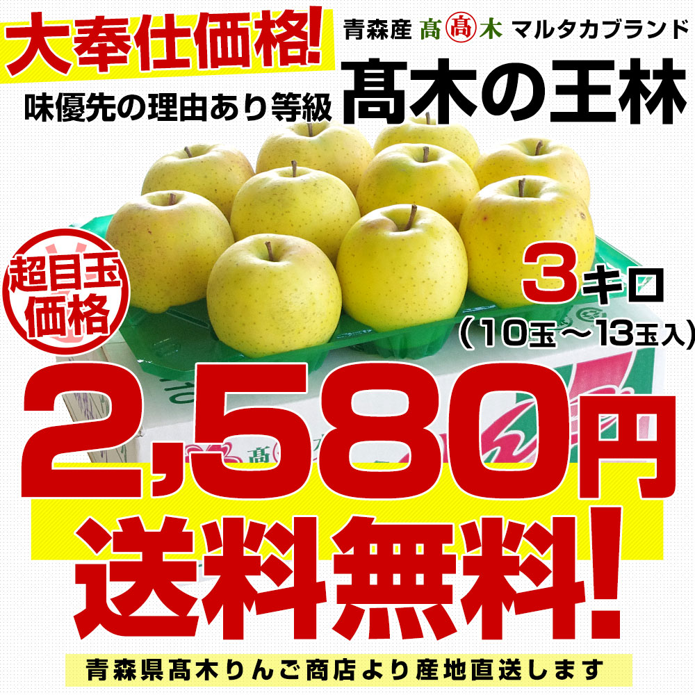 【家計応援価格!】青森県より産地直送 高木商店 マルタカブランド 高木の王林 味優先の理由あり 3キロ (10玉から13玉入) 送料無料 林檎 リンゴ おうりん 津軽
