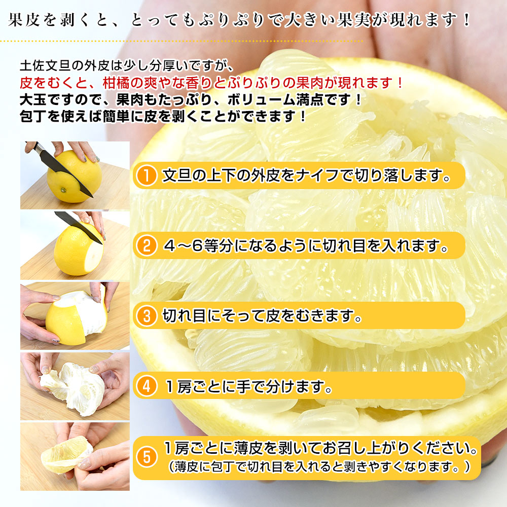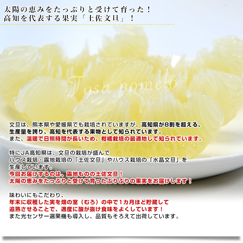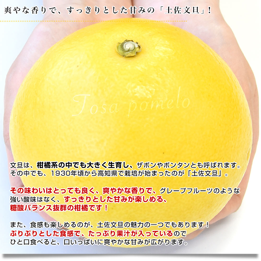 ずっしりと重たく手の平を覆ってしまうほどの大きさの土佐文旦!独特の香りと、すっきりした甘みとぷりぷりとした食感で、果汁がたっぷり入った柑橘です。高知県の特産「土佐文旦」ぜひご賞味ください!