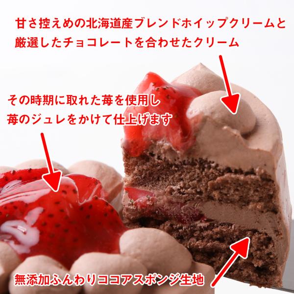 酸味や苦味のあるチョコホイップではなく食べていて飽きない味わいのバランスの取れた甘さ控えめの配合ですのでお子様から大人まで楽しめるチョコレートケーキでデコレーションするイチゴは新鮮さ、香り、色合いなどその時期に最良の旬のいちごを厳選しています。