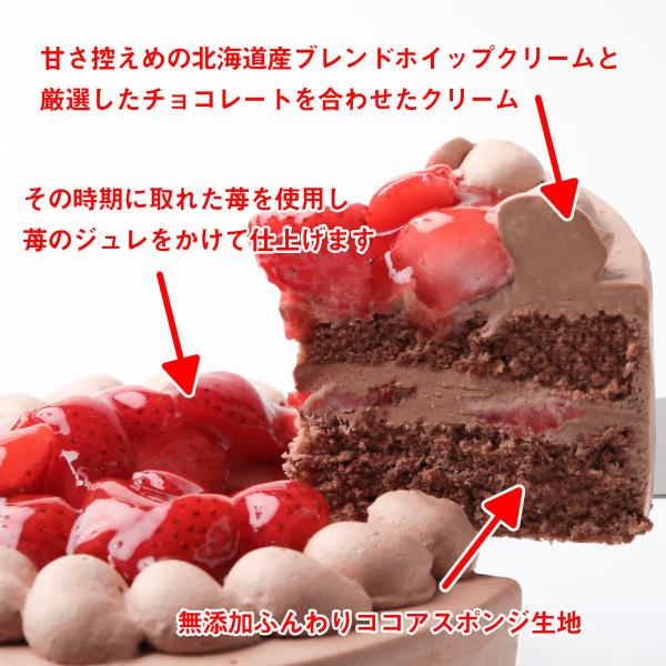 フレッシュ苺とチョコ生クリームをたっぷり使用したデコレーションケーキ!苺はその時期の最も美味しい産地を厳選しサンタアンジェラ特製の苺ジュレをたっぷりと注いで風味を閉じ込めました。