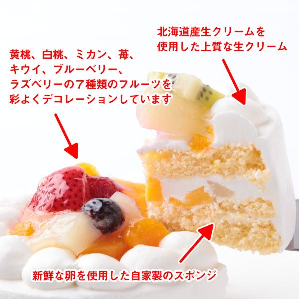 フルーツデコレーションはイチゴ、ラズベリー、ブルーべりー、ミカン、キウィ、黄桃、白桃をデコレーションしてコクがあってくちどけのよい北海道産ブレンドホイップクリームと合わせました。