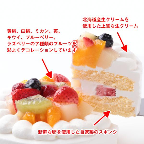 使用原材料:乳等を主原料とする食品(植物油脂・乳脂肪・その他)(国内製造)・卵・砂糖・小麦粉・イチゴ・ラズベリー・ブルーベリー・黄桃・白桃・みかん・キウイ・サラダ油・植物性油脂 /トレハロース・増粘多糖類・酸味料・乳化剤・アプリコット果汁・pH調整剤※一部に小麦、乳、卵 、もも、大豆を含む