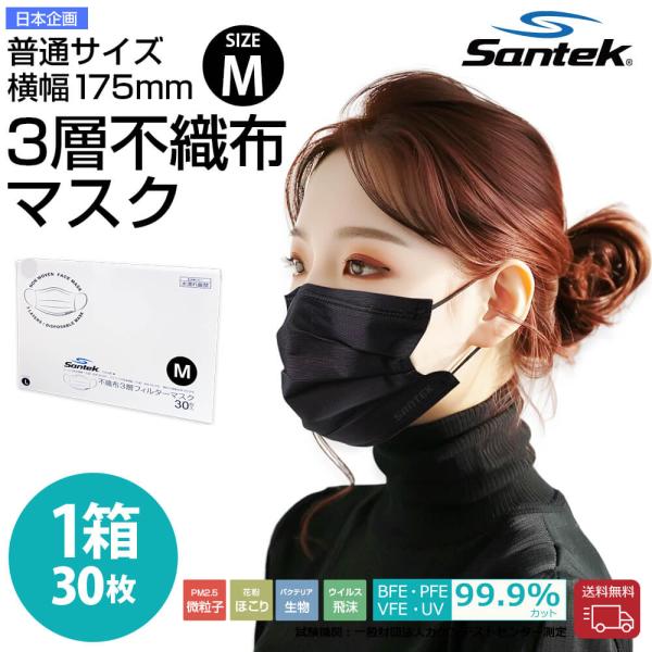 爆買 不織布マスク 黒 Lサイズ 30枚 大きめ 男女兼用 使い捨て 黒マスク UVカット ウィルス対策UPF50+ 紫外線遮光99.9% VFE・BFE99.9% PFE99.8% Santek ◎