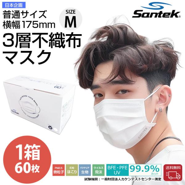 爆買 Santek 不織布マスク 白 M 60枚入り ふつうサイズ 男女兼用 VFE99.9% BFE99.9% PFE99.8% UV87.1%カット 花粉対策 飛沫防止 耳が痛くならない