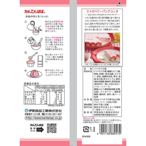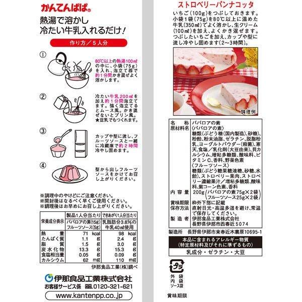 <ババロアの素>糖類(ぶどう糖、粉飴、砂糖)、粉末油脂、ゼラチン、粉乳、発酵乳粉末、寒天、食塩、乳化剤、貝カルシウム、香料、増粘多糖類、酸味料、野菜色素、 (原材料の一部に大豆を含む) <フルーツソース>糖類(ぶどう糖果糖液糖、砂糖、水飴)、ストロベリー、増粘多糖類、酸味料、香料、紫コーン色素