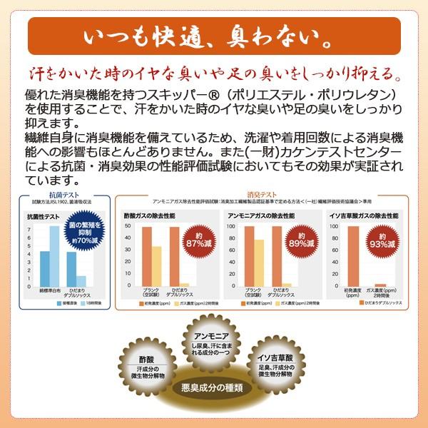 優れた消臭機能を持つスキッパーを使用。汗をかいた時のイヤな臭いや足の臭いをしっかり抑えます。繊維自身に消臭機能を備えているため、洗濯や着用回数による消臭機能への影響もほとんどありません。