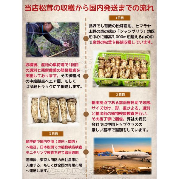 日本税関で輸入食品検査を行い、輸入許可書を取得する上で、更に自社の厳選したものをクール便にてご自宅までお届けいたしますので、一般市場やスーパーなどで流通している松茸と比べると断然違い、多段階の流通ルートを通す事なく産地からの直接仕入によるご提供となります。