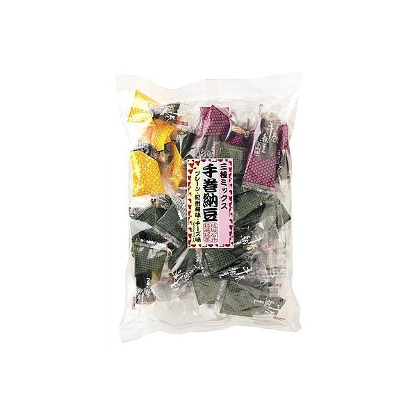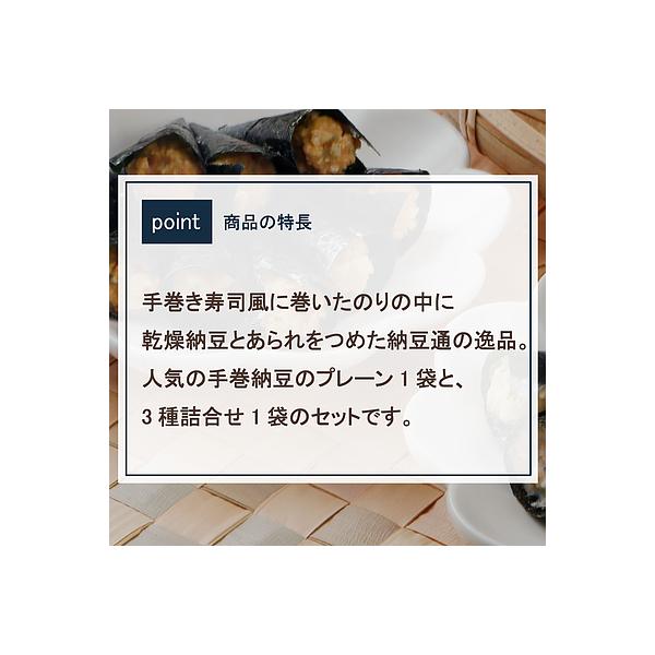 手巻き寿司風に巻いたのりの中に乾燥納豆とあられをつめた納豆通の逸品。人気の手巻納豆のプレーン1袋と、3種詰合せ1袋のセットです。
