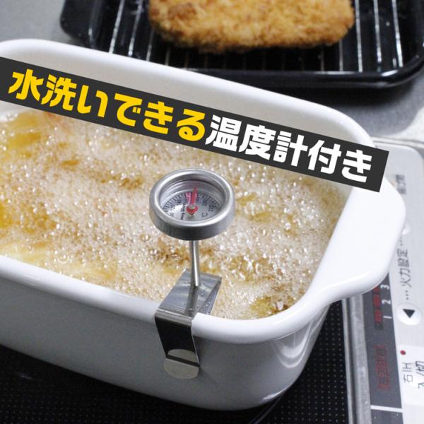 油に直接付けて測れる温度計付きなので、温度の変化がすぐに確認できます。