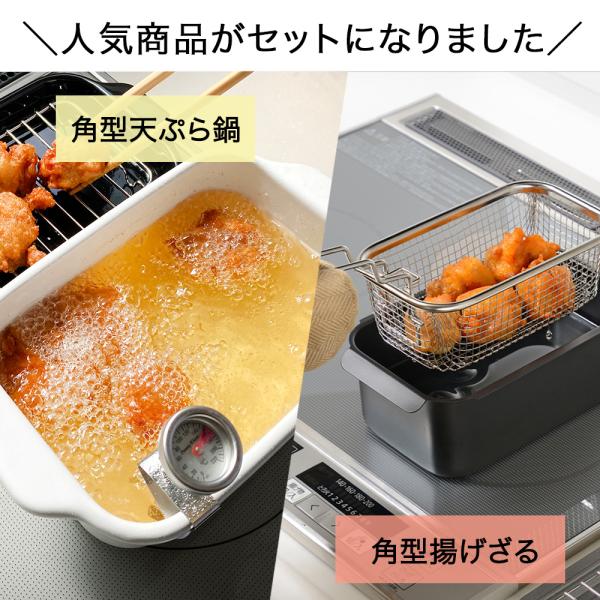 富士ホーロー 角型天ぷら鍋 角型揚げざる 2点セット 温度計付き バット ih 天ぷら鍋 四角い ホーロー鍋 角型 スクエア 鍋 揚げざる フライヤー