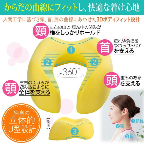 【抜群のフィット感とホールド感】人間工学に基づき、頭や首、肩などの曲線にあわせた独自の立体的U型設計を採用。肉厚の低反発素材で後頭部・頸椎・あごを360度包み込み、首への負担を和らげ疲労を軽減します。