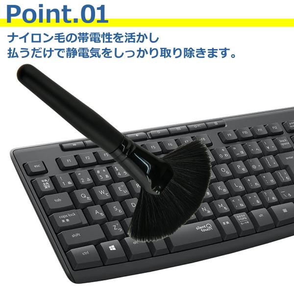 この静電気除去ブラシは、パソコンのキーボードや電子機器周りにたまる埃やゴミを効果的に取り除きます。