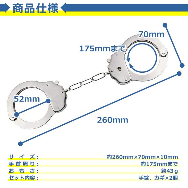 手錠 アルミ製 鍵つき 安全装置 コスプレ パーティ イベント ハロウィン 警官 警察 ポリス 囚人 仮装 大人 子供 金属 小物 小道具 衣装 頑丈