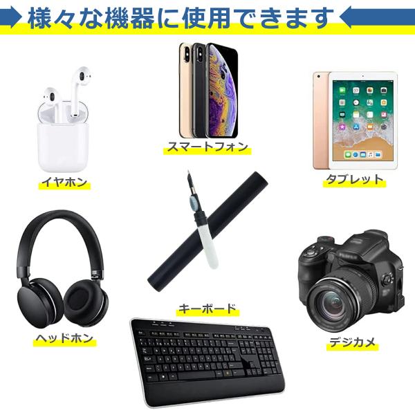 イヤホンだけでなく、スマートフォン、タブレット、ヘッドホン、キーボード、デジカメなど、多様なデバイスの掃除にも最適です。