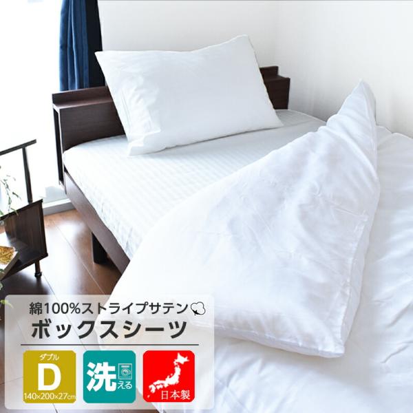 ボックスシーツ ダブル 綿100% 日本製 サテン織り 洗える 140x200x27 ホワイト 高級ホテル仕様 送料無料