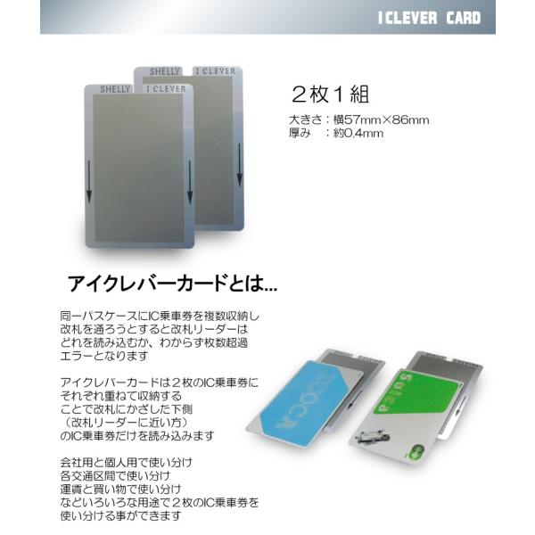 SHELLY製のIC乗車券使い分けカードです。 IC乗車券の裏側に重ねて使用いたします。使い分けたいIC乗車券2枚に重ねてご使用ください。この商品は2枚1組になっております。単パスの使い分け用です。