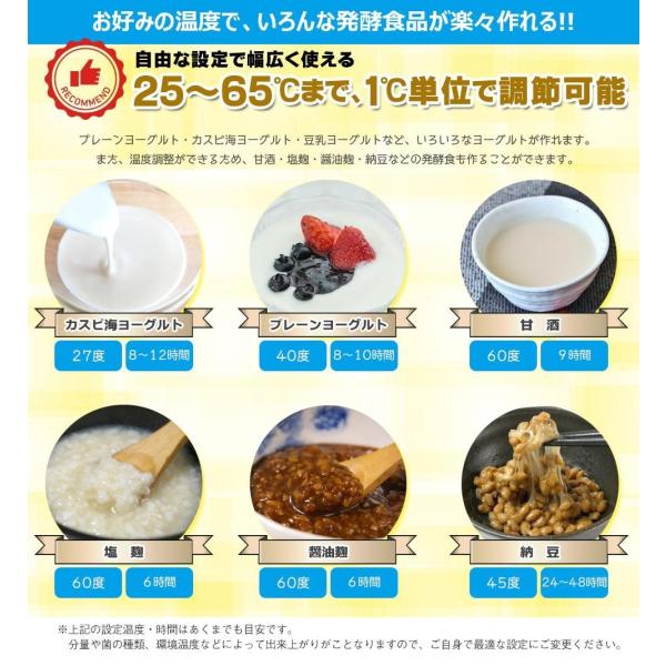 便利な温度設定とタイマー付きで、甘酒、塩麹、醤油麹も作れます。