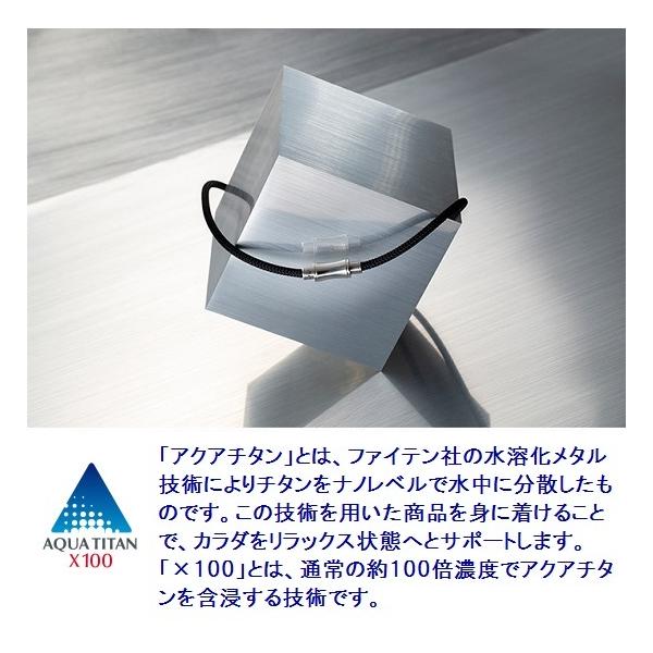 「アクアチタン」とは、ファイテン社の水溶化メタル技術によりチタンをナノレベルで水中に分散したものです。この技術を用いた商品を身に着けることで、カラダをリラックス状態へとサポートします。「×100」とは、通常の約100倍濃度でアクアチタンを含浸する技術です。