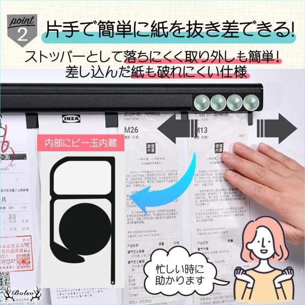 ・片手でサッと簡単に紙を抜き差しすることができます内部にはビー玉が内蔵されているため、ストッパーとしての役割を果たし落ちにくい仕組みになっていますまた、取り外しも簡単なため差し込んだ紙も破れにくい仕様になっています