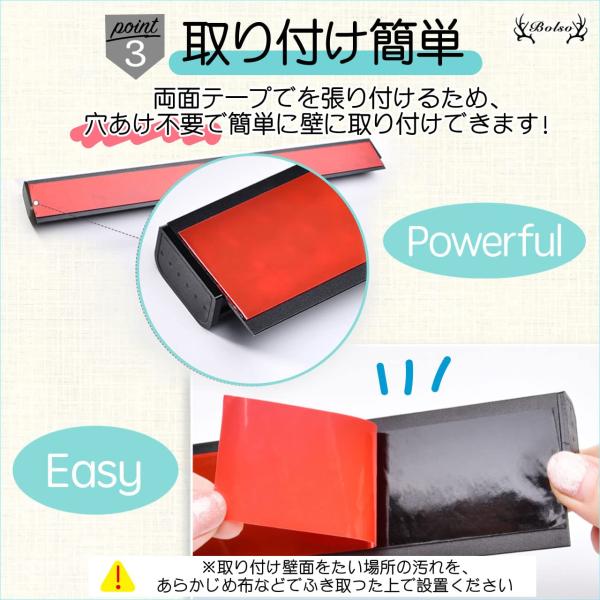 ・取り付けは簡単両面テープで張り付けるため、穴あけ不要で簡単に壁に取り付けできます取り付ける壁面の汚れをあらかじめ布などでふき取った上で設置ください。